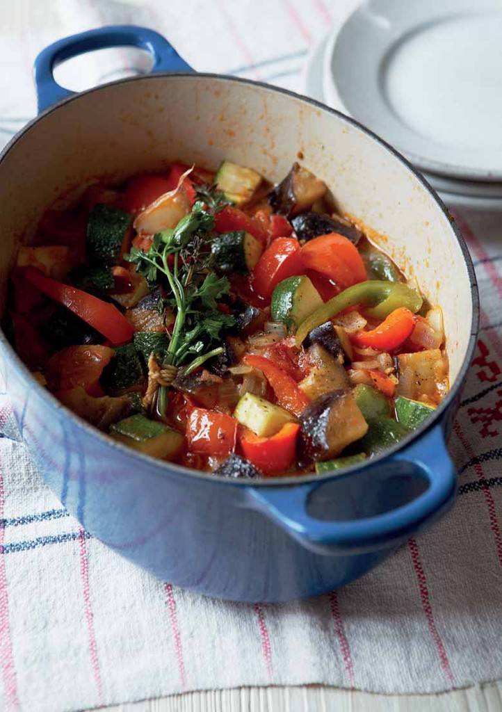 Cover the pot of vegetables and tomato sauce with parchment paper and then the lid of the pot. Sprinkle seasoning and salt and freshly ground pepper over the vegetables and drizzle with the olive oil. It's a stew of zucchini, peppers, tomatoes and eggplant, with herbs and spices and some onions and garlic usually thrown in for good measure.